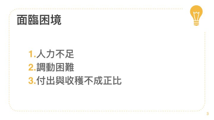 2、調度困難:多數的臨心師均在醫院機構內服務,有長照興趣的臨心師容易被各自機構困住,有工作彈性的行動臨心師又未必對長照領域感興趣,因此產生了供需不平衡的現象,造成長照專員轉介個案時偶有派不出去之困境,以高雄市為例,在公會幹事的多次努力媒合與臨心師的熱情支援下,可降低這樣的困境。