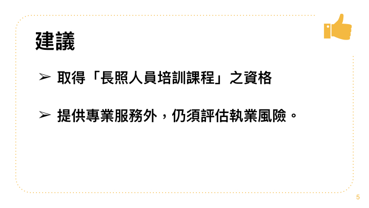 四年前不明白取得Level I資格的意義,直到四年後才知道,需要取得Level I及II資格的人才能提供居家失能服務,目前還有許多長照課程或資格培訓的課程正在開課中,如Level III或長照人員執照等,建議至少先取得資格後,才有機會去選擇,而不是等著被別人決定或選擇。